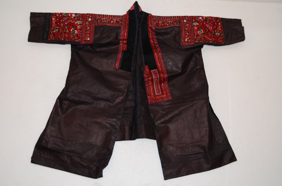分布在凱里、雷山、丹寨、麻江四縣交界地一帶苗族村寨,以凱里舟溪苗族為代表。該服裝上衣為緞面對襟衣,刺繡主要在肩袖及袖口部分,以黔東南苗族特有的繭片繡為主,所繡圖案為浮萍花和幾何紋,肩部和背部鑲有銀泡和銀片,具有民族特點 。前、后圍腰片均以繭片繡為主,所繡圖案為浮萍花和幾何紋。