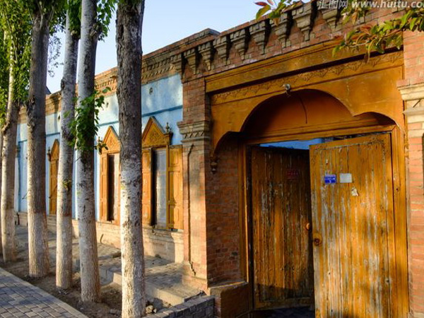 維吾爾族的居室一般是土木結(jié)構(gòu)平房,其建筑方式是以粗木或沙石作基,土塊砌墻,或笆子墻,房頂架梁檁、椽后鋪葦席加土抹泥。房屋平頂,開天窗采光,四壁不開窗只留門,房門忌朝西。現(xiàn)在,建筑式樣發(fā)生變化,多留壁窗,建材也多由土木結(jié)構(gòu),向磚、混凝土結(jié)構(gòu)發(fā)展。室內(nèi)布置過去較為簡單,一般多砌土炕,炕一側(cè)隔矮墻砌鍋臺,墻上留有壁翕,放置物品,喜掛壁毯。冬季多燒爐子、火墻取暖。院內(nèi)多植有葡萄和果樹花卉。房門口兩側(cè)砌土臺,上鋪氈毯,用以夏天乘涼、睡覺。