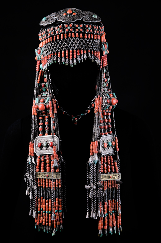額頂飾:飾在頭箍之上, 形狀近似橢圓形,前部有四塊方形銀片,上掐絲嵌綠松石和珊瑚,其中最前部掐絲鑲紅珊瑚、綠松石拼成的蝴蝶型圖案, 銀掐絲工藝為托座。從整體來看銀絲捧紅花綠葉, 十分美麗。額頂飾兩端縫于青緞頭箍上, 居于整個頭飾的中心位置。