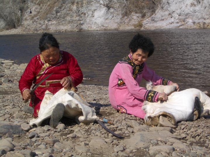 鄂倫春人過(guò)去在家庭公社“烏力鄰”里,同生產(chǎn)共消費(fèi),在當(dāng)時(shí)生產(chǎn)力十分低下的情況下,憑著扎槍和弓箭,單個(gè)人很難獲得能夠滿足衣食需要的獵物,必須要有“烏力鄰”全體成員的通力合作,才能戰(zhàn)勝兇猛和龐大的野獸,所以,在“塔坦達(dá)”領(lǐng)導(dǎo)下的集體狩獵是當(dāng)時(shí)最主要的勞動(dòng)形式。隨著生產(chǎn)力的不斷發(fā)展和個(gè)體小家庭的大量流動(dòng),不僅社會(huì)組織“烏力鄰”由原來(lái)血緣性的家庭公社演變?yōu)榈鼐壭缘牡赜蚬?,勞?dòng)組織也隨之發(fā)生了極大的變化。集體狩獵已不再是“烏力鄰”傾巢出動(dòng),而是由幾個(gè)小家庭的成員自愿結(jié)合成“安嘎”來(lái)進(jìn)行。同時(shí)還出現(xiàn)了集體和個(gè)人等多種勞動(dòng)形式。狩獵也不再單純是為了滿足衣食的需要,剩余獵物可以拿去交換,獵產(chǎn)品已趨于商品化。故此時(shí)一些珍貴的細(xì)毛皮張和藥用價(jià)值較高的獸類,成了鄂倫春人主要的狩獵目標(biāo)。這樣就形成了一年中的四個(gè)狩獵旺季,即:農(nóng)歷正月至2月是“鹿胎期”;4月至6月是“鹿茸期”;9月至落雪為“叫鹿尾期”;落雪后至來(lái)年開春是“打皮子期”。大概是源于原始的圍獵,鄂倫春人把狩獵叫“打圍”,而這四個(gè)狩獵旺季就叫“紅圍期”。“紅圍期”除“叫鹿尾期”外,都組織“安嘎”集體出獵?!鞍哺隆笔且环N臨時(shí)性的狩獵組織,狩獵旺季將臨時(shí),由一人發(fā)起,串聯(lián)幾位親朋好友或志趣相投的人組成一個(gè)“安嘎”,待獵期結(jié)束,“安嘎”自行解散,下次出獵時(shí)再重新組合,因此其成員并不是固定的(圖為熟化狍皮,吳雅芝攝影)。