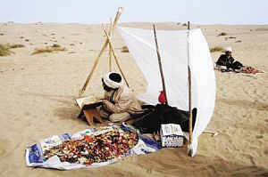 2004年6月,和田市和田縣庫(kù)克馬日暮麻扎,民間藝人在表演說唱