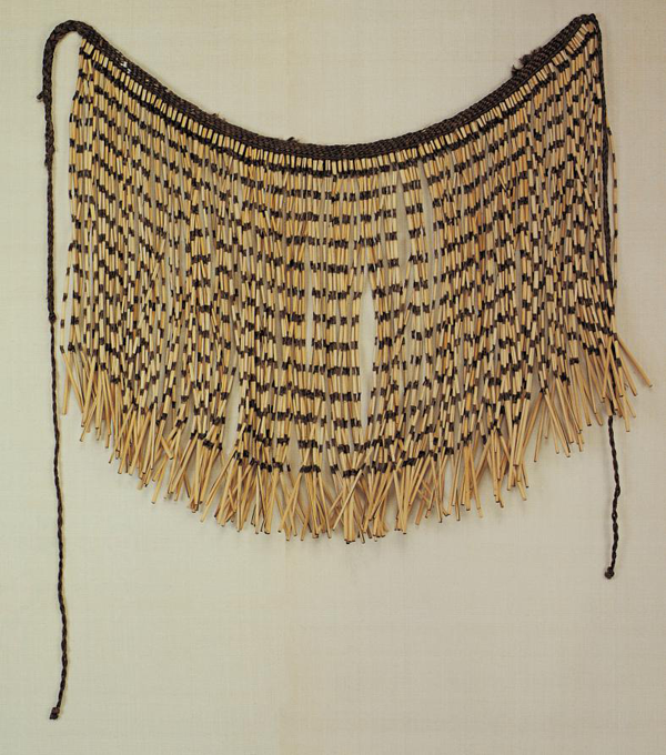 博嘎?tīng)枊D女穿一種叫“基都”的短上衣。用野麻織成的土布縫制,其樣式為無(wú)領(lǐng)、短袖、對(duì)襟。下部穿用羊毛織成的粗呢緊身筒裙,稱(chēng)作“結(jié)邦”。小腿部扎裹腿,叫“涅蘇木”。條件好的人家外面還會(huì)罩一件稱(chēng)為“階納布”的披肩。希蒙部落的婦女穿當(dāng)?shù)孛藁棾傻陌咨蛩{(lán)色的寬大對(duì)襟短上衣。下身穿筒裙,裙子下擺較寬,上面織有黃紅色或黃黑色的簡(jiǎn)單圖案(圖為民國(guó)時(shí)期的珞巴族草裙,中央民族大學(xué)民族博物館館藏)。