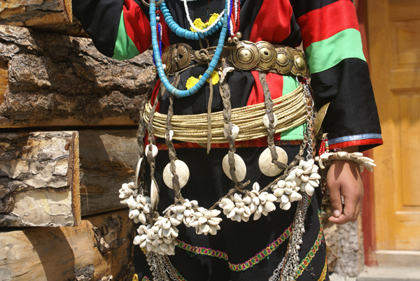 珞巴族男女都喜歡佩帶裝飾品,男子戴手鐲、竹管耳環(huán)、項(xiàng)鏈,腰間掛弓箭、長(zhǎng)刀等物。婦女特別喜歡佩戴五顏六色的項(xiàng)珠,盛裝的婦女脖頸上有時(shí)戴十幾串到幾十串珠子,再加上手鐲、耳環(huán)、銅鈴、銀幣、鐵鏈、小刀、火鐮、海貝等飾物,有十幾斤重,可裝滿(mǎn)一個(gè)竹背筐,并被視為家庭財(cái)富多寡的標(biāo)志,不可缺少的嫁妝。