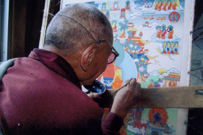 嘎瑪噶赤畫派,屬西藏東部地區(qū)畫派。相傳由郎卡扎西所創(chuàng),與其同時(shí)期的八世噶瑪巴米久多吉,奠定了嘎瑪噶赤畫派的理論基礎(chǔ)。十六世紀(jì),嘎瑪噶赤畫派開始盛行康區(qū),先后涌現(xiàn)出了一批大師。嘎瑪噶赤畫派在發(fā)展過(guò)程中,由于生存地域與漢地緊密相連,在政治、經(jīng)濟(jì)、文化上的交往也相對(duì)頻繁,尤其在繪畫方面,多受漢地明代以后工筆重彩畫和四川綿竹木版年畫的影響。嘎瑪噶赤畫派在嚴(yán)格繼承傳統(tǒng)繪畫的基礎(chǔ)上大膽創(chuàng)新,吸收漢族畫家工筆重彩之精華,注重抒情寫意之風(fēng)格;講究色彩對(duì)比,結(jié)構(gòu)嚴(yán)謹(jǐn),畫工細(xì)膩,最后達(dá)到精美絕倫之境界。其總體風(fēng)格形成了有別于衛(wèi)藏地區(qū)門唐、欽澤兩大畫派的特征。二十世紀(jì)初,噶瑪噶赤畫派藝術(shù)更為完善和成熟。