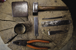 制蘆笙的幾個(gè)關(guān)鍵技術(shù)活——安簧片、點(diǎn)鉛、校音等工序,得由楊枝光親自上。他從工具箱里翻出一只薄薄的銅片,先是湊近看了看,中指輕彈了銅片后把它放到耳朵邊聽(tīng),似乎覺(jué)得聲音不太悅耳,于是又把銅片放在砧上用鐵錘敲打,再看、再?gòu)?、再?tīng)……反復(fù)四五遍后,他總算滿(mǎn)意了,這才把銅片粘在笙管底端開(kāi)口處。裝入簧片,蘆笙才算安裝好。