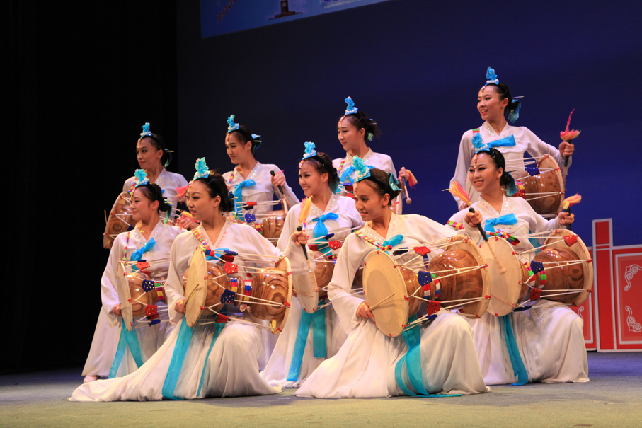 扇舞:表演者多為女性,需持花扇表演。源于古代巫女活動及民俗活動中的扇子表演,后發(fā)展成為單扇舞、雙扇舞兩種形式。扇舞有持一把或兩把扇具的不同形式,它具有朝鮮族特有的節(jié)奏、含而不露的內在情緒、曲線性的律動和自由自在的表演,隨著隊形的不斷變化,舞者將手中的扇具可組合成豐富多樣的圖案和造型。